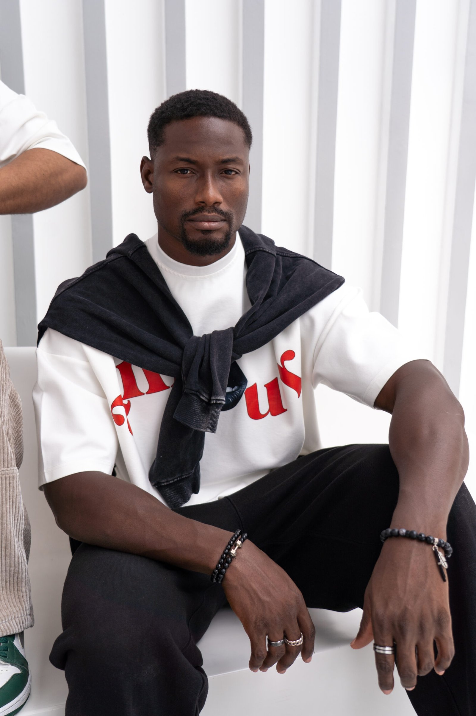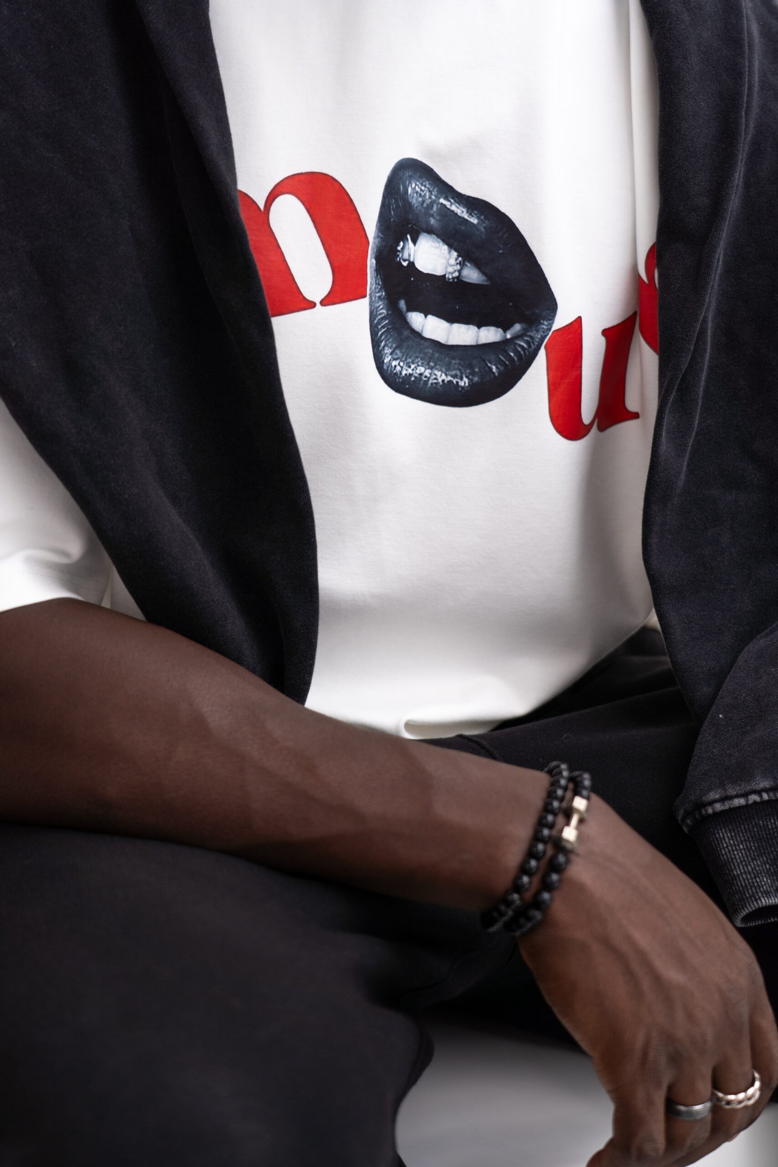 Stylish white T-shirt featuring a bold orange-red text print and vibrant lips design — eye-catching yet tastefully elegant.